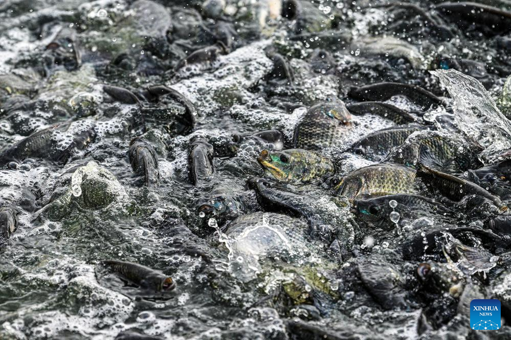 This photo taken on Sept. 8, 2025 shows fish in a breeding pond in Jiamei Village, Wenchang City, south China's Hainan Province. In recent years, Jiamei Village of Hainan Province has been advancing its rural revitalization. The village has developed industries such as cultural tourism, yellow cattle farming, fruit and vegetable cultivation, and aquaculture drawing on its rich history, culture and natural resources. In 2023, Jiamei Village was listed in the sixth batch of traditional Chinese villages catalog. (Xinhua/Pu Xiaoxu)