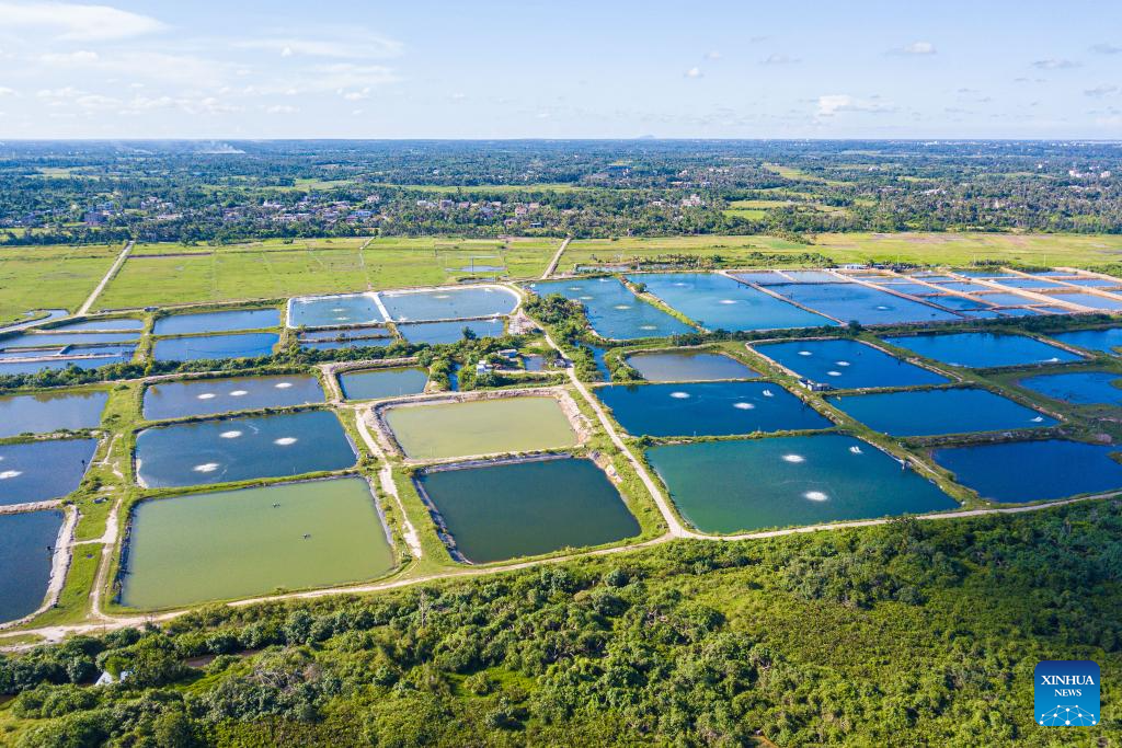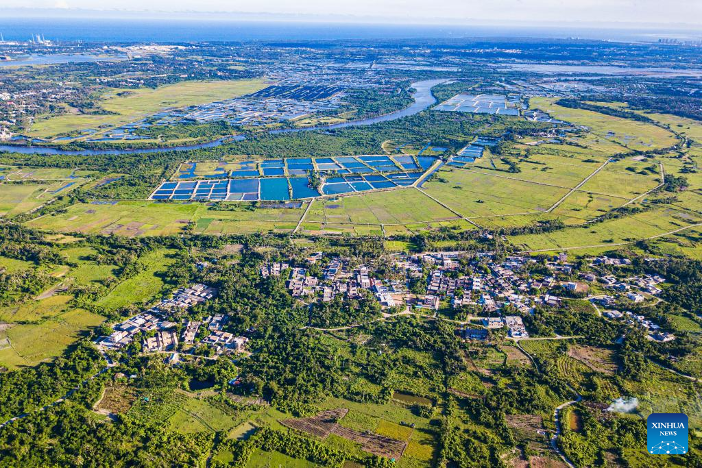 A drone photo taken on Sept. 3, 2025 shows a view of fish ponds in Jiamei Village, Wenchang City, south China's Hainan Province. In recent years, Jiamei Village of Hainan Province has been advancing its rural revitalization. The village has developed industries such as cultural tourism, yellow cattle farming, fruit and vegetable cultivation, and aquaculture drawing on its rich history, culture and natural resources. In 2023, Jiamei Village was listed in the sixth batch of traditional Chinese villages catalog. (Xinhua/Pu Xiaoxu)
