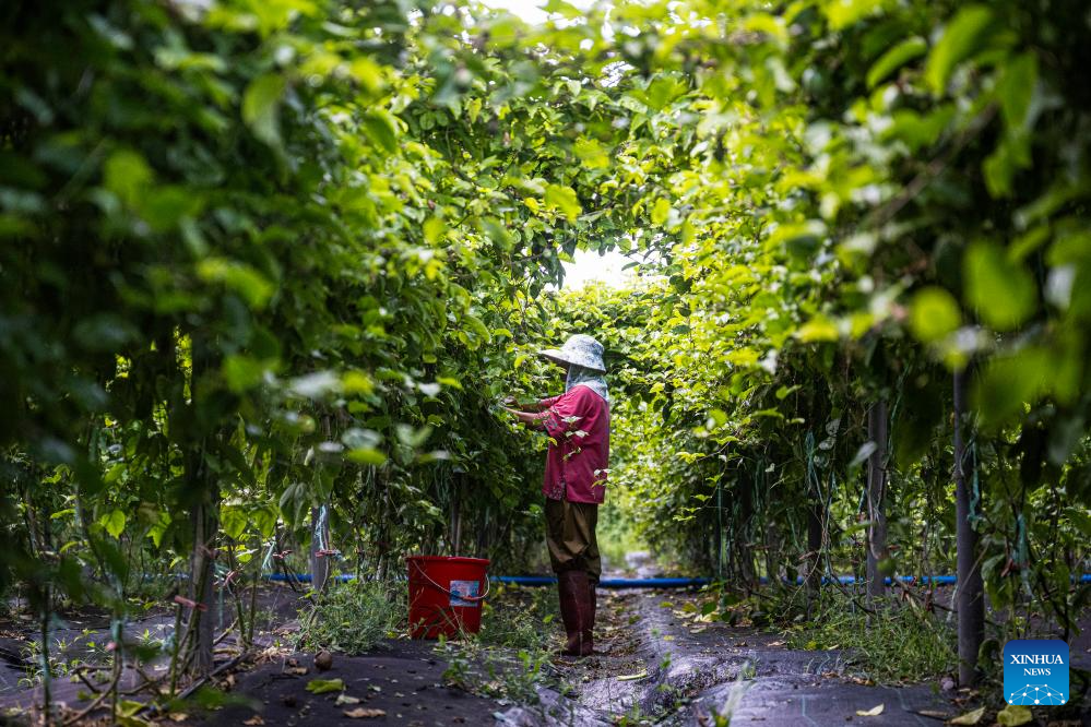 A farmer picks passion fruits at a planting base in Jiamei Village, Wenchang City, south China's Hainan Province, Sept. 11, 2025. In recent years, Jiamei Village of Hainan Province has been advancing its rural revitalization. The village has developed industries such as cultural tourism, yellow cattle farming, fruit and vegetable cultivation, and aquaculture drawing on its rich history, culture and natural resources. In 2023, Jiamei Village was listed in the sixth batch of traditional Chinese villages catalog. (Xinhua/Pu Xiaoxu)