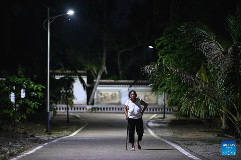 This photo taken on Sept. 10, 2025 shows the night view of Jiamei Village, Wenchang City, south China's Hainan Province. In recent years, Jiamei Village of Hainan Province has been advancing its rural revitalization. The village has developed industries such as cultural tourism, yellow cattle farming, fruit and vegetable cultivation, and aquaculture drawing on its rich history, culture and natural resources. In 2023, Jiamei Village was listed in the sixth batch of traditional Chinese villages catalog. (Xinhua/Pu Xiaoxu)