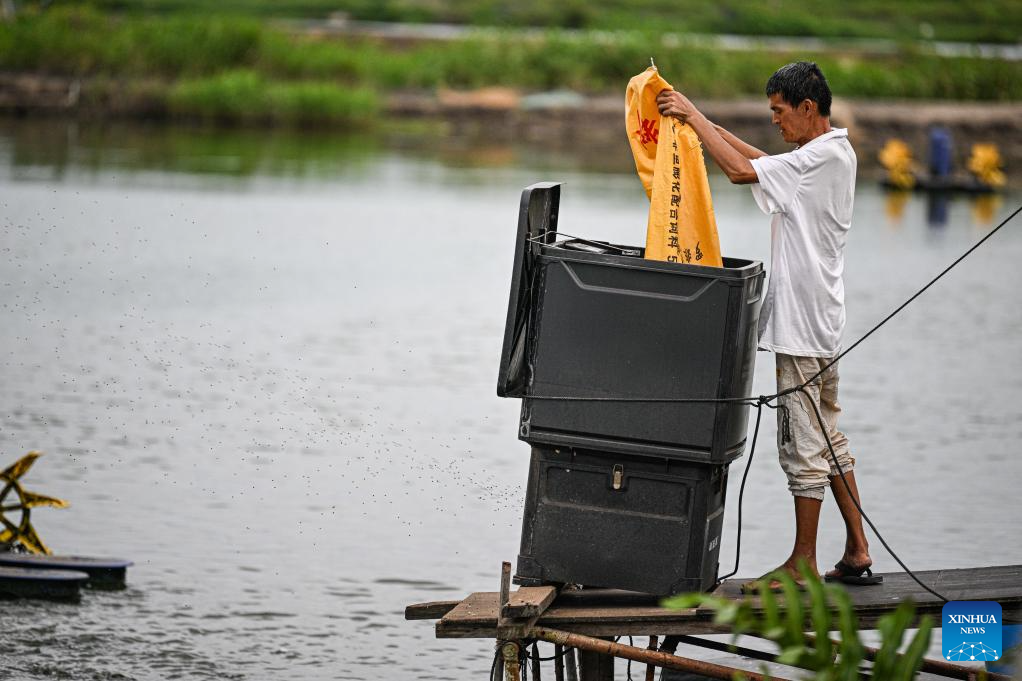 A villager uses a feeder to feed fish in a breeding pond in Jiamei Village, Wenchang City, south China's Hainan Province, Sept. 8, 2025. In recent years, Jiamei Village of Hainan Province has been advancing its rural revitalization. The village has developed industries such as cultural tourism, yellow cattle farming, fruit and vegetable cultivation, and aquaculture drawing on its rich history, culture and natural resources. In 2023, Jiamei Village was listed in the sixth batch of traditional Chinese villages catalog. (Xinhua/Pu Xiaoxu)