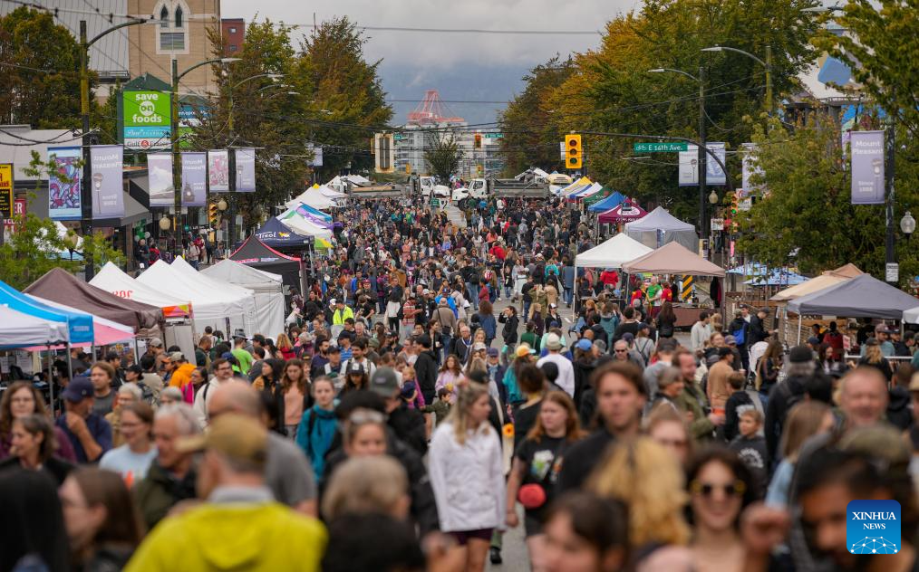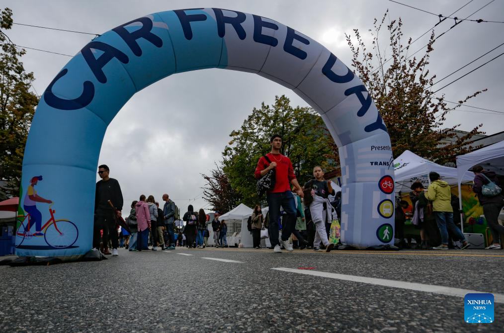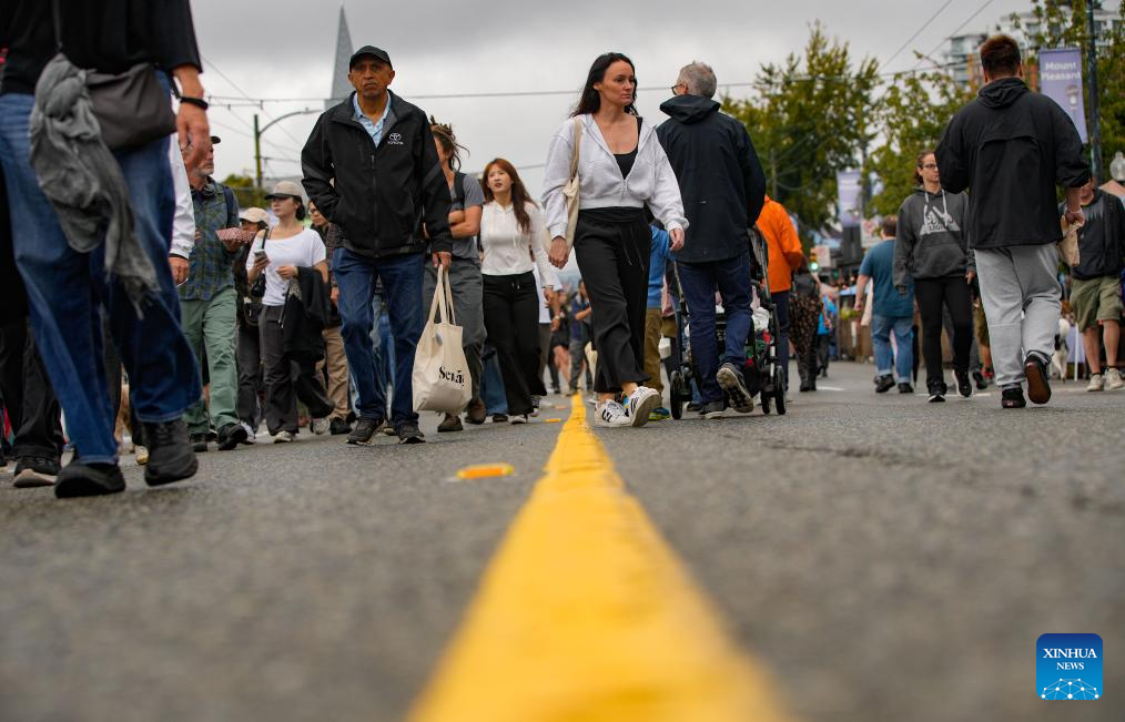 People walk on a closed street during the annual Car Free Day event in Vancouver, British Columbia, Canada, Sept. 14, 2025. The annual community event was held here on Sunday, with 20 blocks of streets closed and transformed into a pedestrian-friendly environment aimed at promoting sustainable transportation and neighborhood culture. (Photo by Liang Sen/Xinhua)