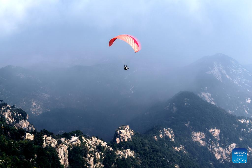 An aerial drone photo taken on Sept. 14, 2025 shows tourists experiencing paragliding at a scenic area in Linyi City, east China's Shandong Province. People across the country enjoy the autumn scenery in various ways during the weekend. (Photo by Wu Jiquan/Xinhua)