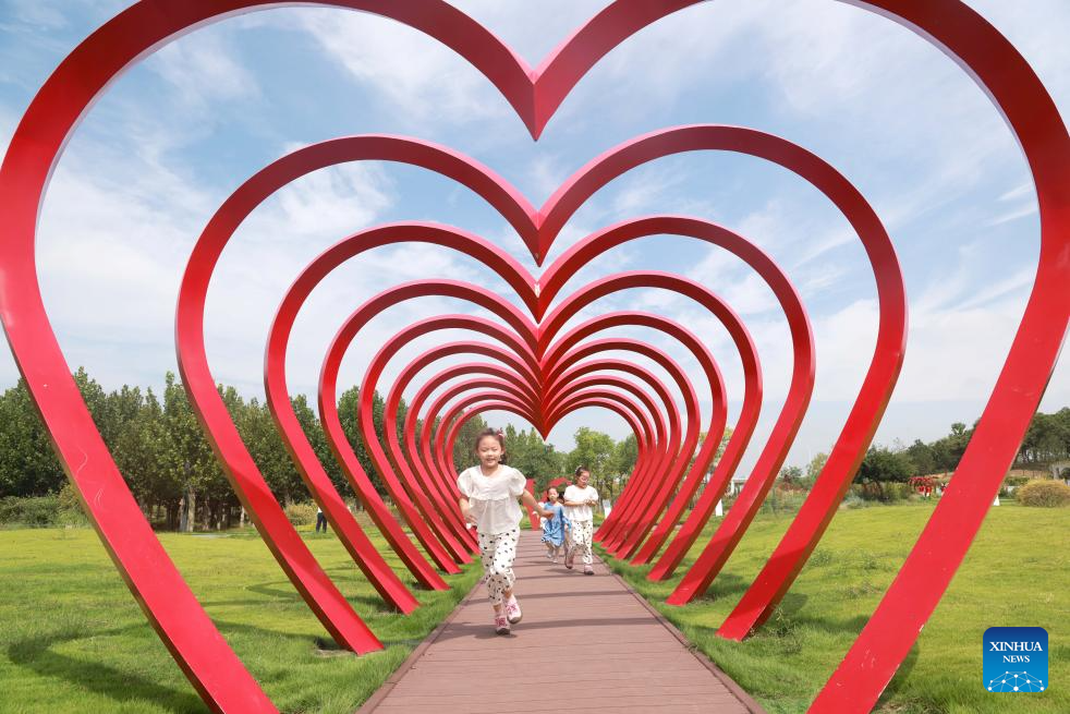 Children have fun at a park in Linyi City, east China's Shandong Province, Sept. 13, 2025. People across the country enjoy the autumn scenery in various ways during the weekend. (Photo by Xu Chuanbao/Xinhua)