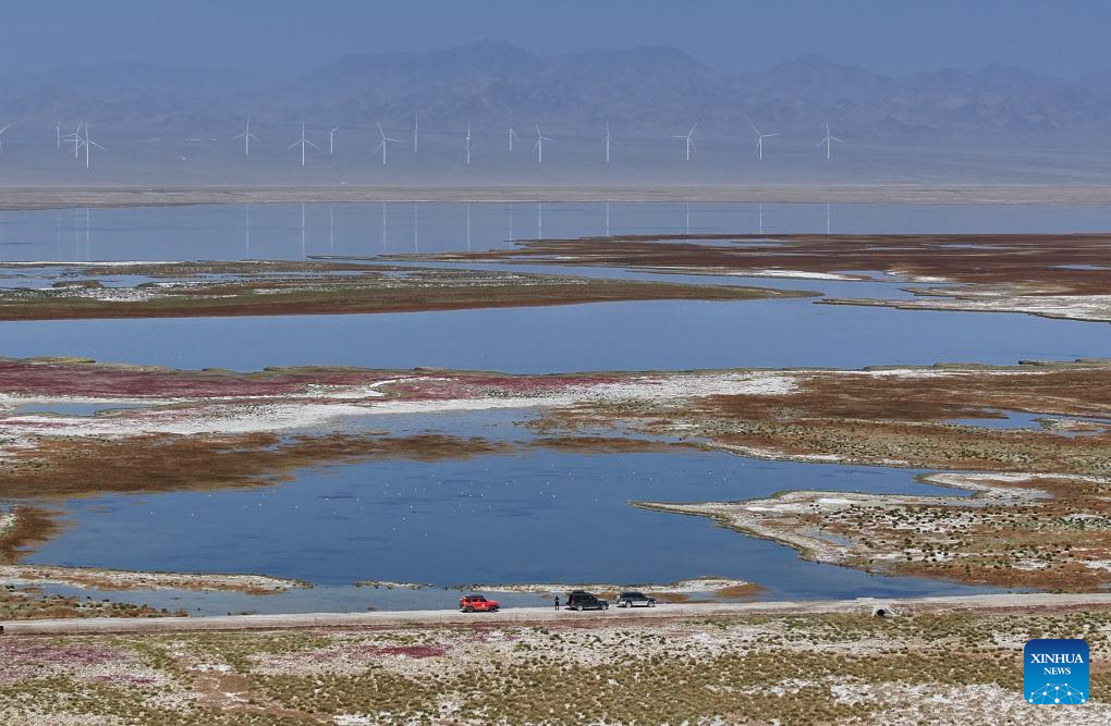 An aerial drone photo taken on Sept. 13, 2025 shows tourists visiting a wetland in Kazak Autonomous County of Aksay, northwest China's Gansu Province. People across the country enjoy the autumn scenery in various ways during the weekend. (Photo by Gao Hongshan/Xinhua)