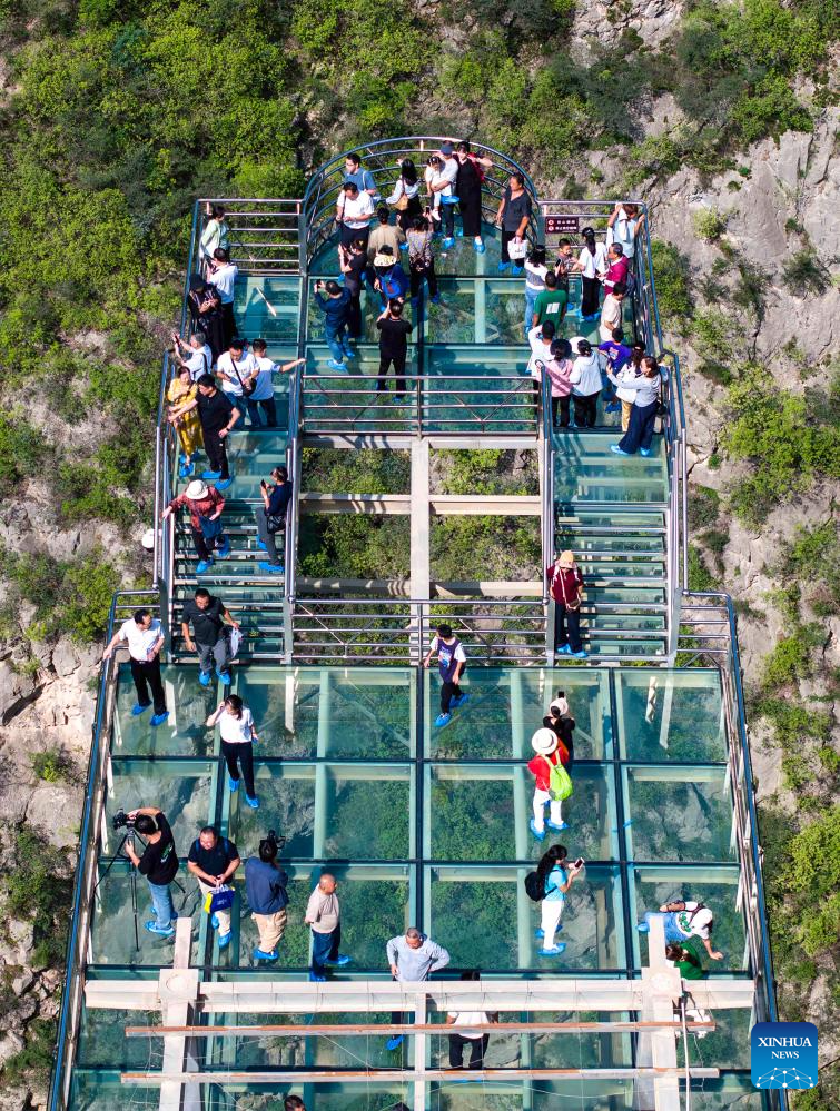 An aerial drone photo taken on Sept. 14, 2025 shows tourists visiting a scenic area in Jingyang County of Xianyang City, northwest China's Shaanxi Province. People across the country enjoy the autumn scenery in various ways during the weekend. (Photo by Tang Dehong/Xinhua)