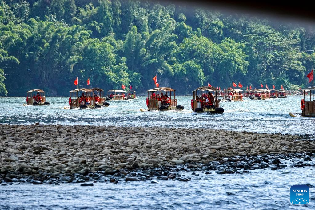 Tourists experience taking bamboo rafts in Xingping Town of Guilin City, south China's Guangxi Zhuang Autonomous Region, Sept. 13, 2025. People across the country enjoy the autumn scenery in various ways during the weekend. (Photo by Yu Xiangquan/Xinhua)