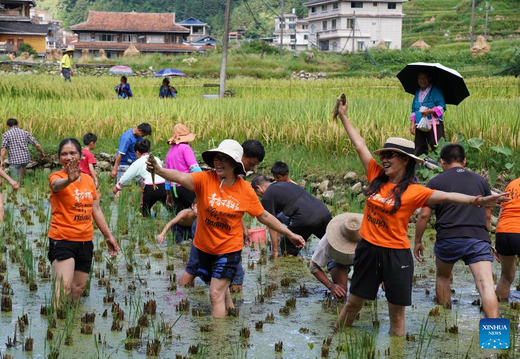 Tourists and villagers catch fishes at a field in Peixiu Village of Antai Township in Rongshui Miao Autonomous County, south China's Guangxi Zhuang Autonomous Region, Sept. 13, 2025. People across the country enjoy the autumn scenery in various ways during the weekend. (Photo by Long Linzhi/Xinhua)