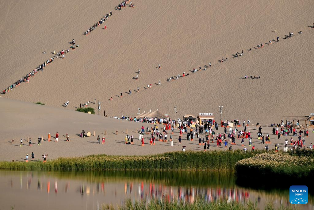 Tourists visit the Mingsha Mountain and Crescent Spring scenic spot in Dunhuang City, northwest China's Gansu Province, Sept. 13, 2025. People across the country enjoy the autumn scenery in various ways during the weekend. (Photo by Zhang Xiaoliang/Xinhua)