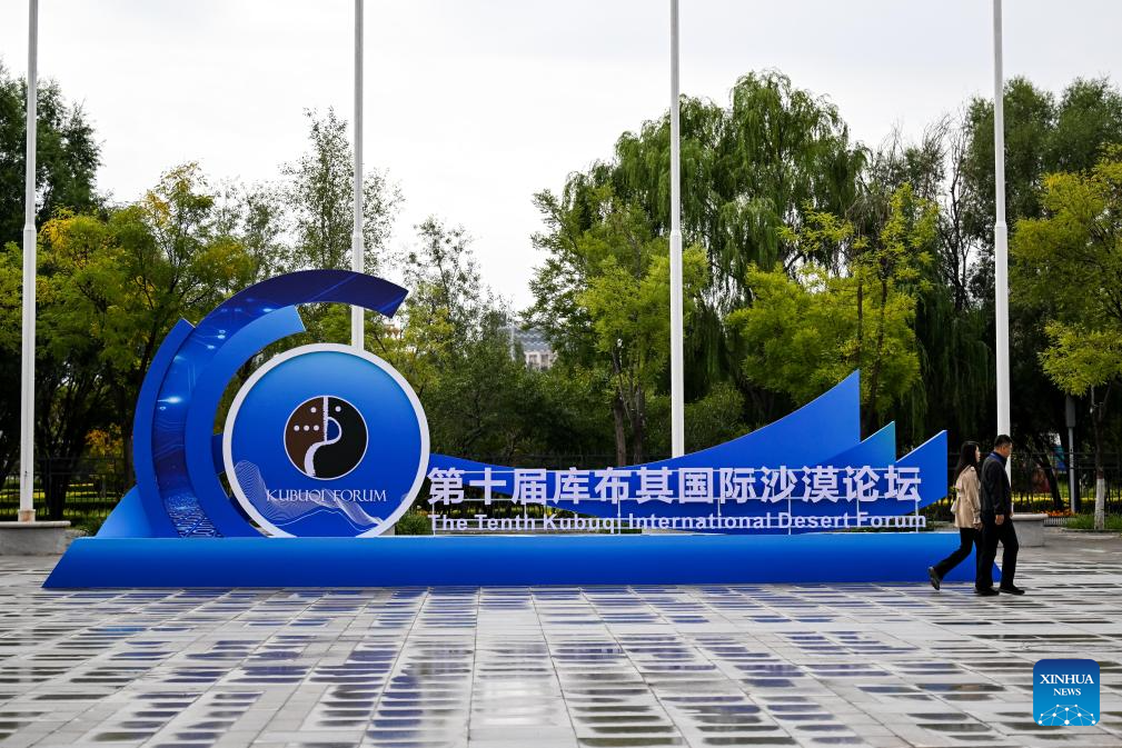 People walk past a logo of the 10th Kubuqi International Desert Forum in Ordos, north China's Inner Mongolia Autonomous Region, Sept, 16, 2025. The event kicked off here on Tuesday under the theme "Scientific Desertification Control, Green Development." (Xinhua/Li Zhipeng)