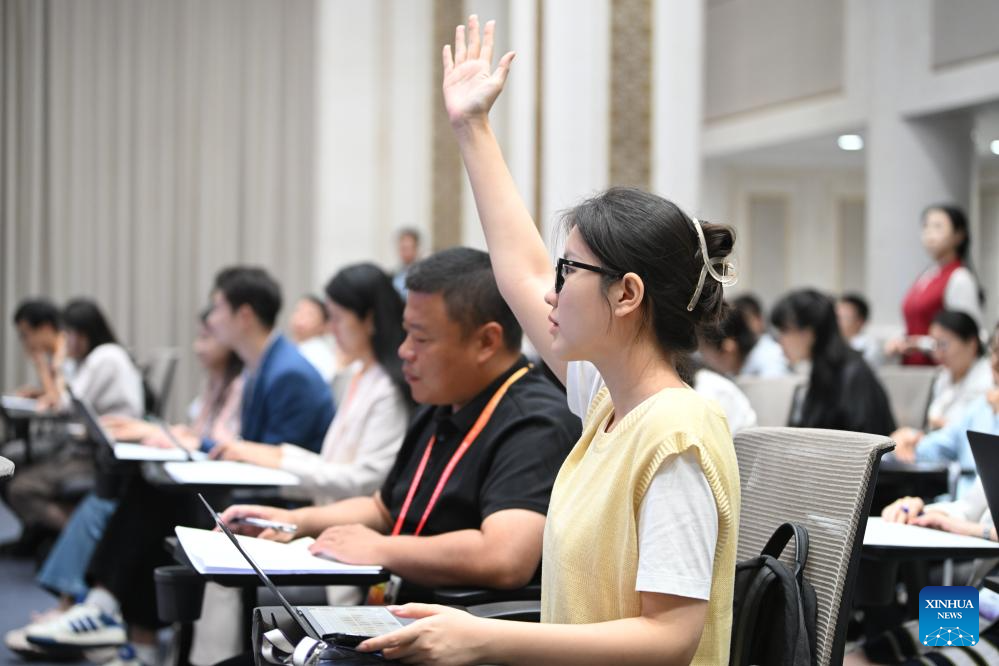 A journalist raises her hand to ask questions at a press conference held by the State Council Information Office (SCIO) on achievements in agricultural and rural development during the 14th Five-Year Plan period (2021-2025) in Beijing, capital of China, Sept. 16, 2025. (Xinhua/Chen Yehua)