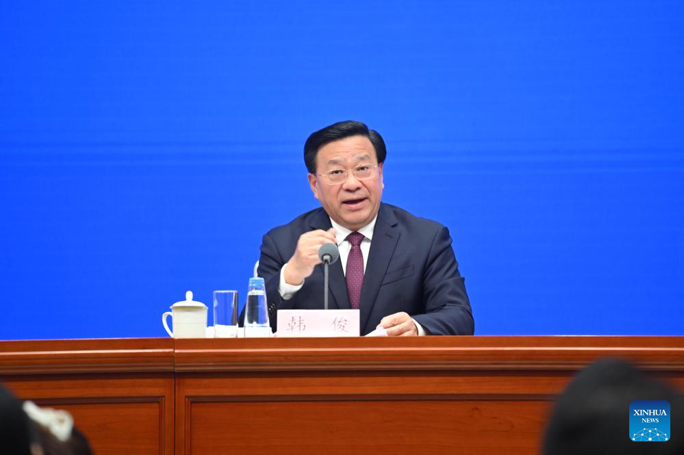 Chinese Minister of Agriculture and Rural Affairs Han Jun speaks at a press conference held by the State Council Information Office (SCIO) on achievements in agricultural and rural development during the 14th Five-Year Plan period (2021-2025) in Beijing, capital of China, Sept. 16, 2025. (Xinhua/Chen Yehua)