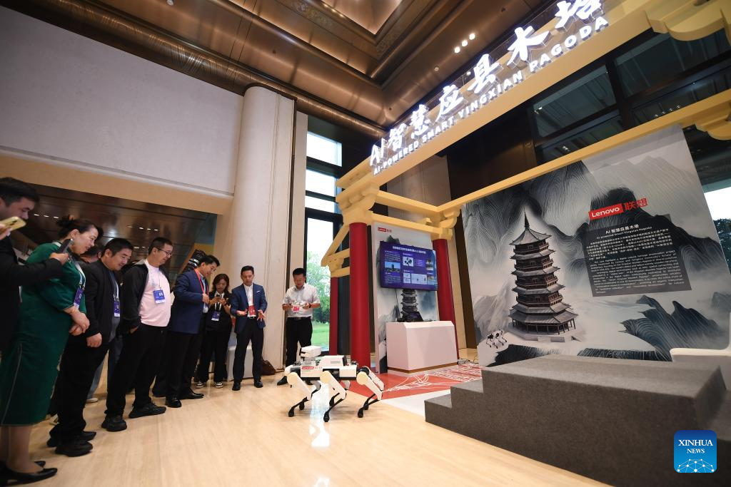 Guests learn about a digital protection project for an ancient wooden pagoda during an exhibition of the 2025 World Internet Conference Cultural Heritage Digitalization Forum in Xi'an, northwest China's Shaanxi Province, Sept. 17, 2025. The forum opened on Wednesday in Xi'an, home to the world-famous Terracotta Warriors.