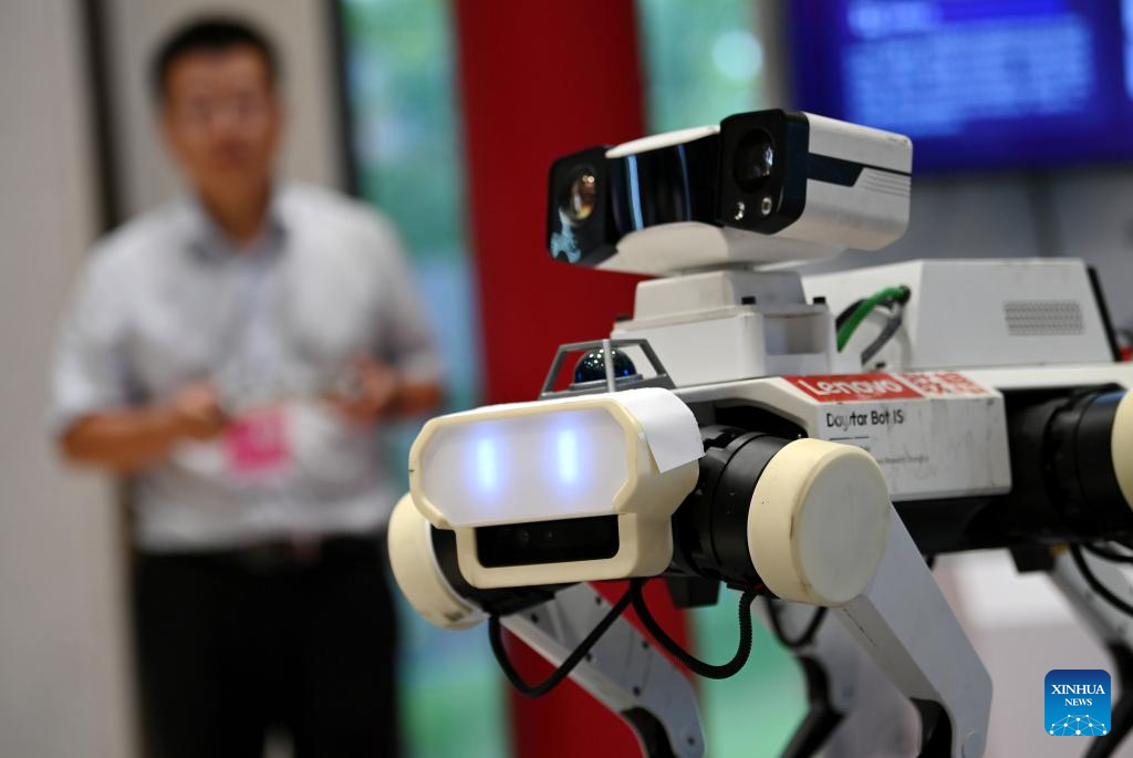 This photo taken on Sept. 17, 2025 shows a robot dog used in a digital protection project for an ancient wooden pagoda during an exhibition of the 2025 World Internet Conference Cultural Heritage Digitalization Forum in Xi'an, northwest China's Shaanxi Province. The forum opened on Wednesday in Xi'an, home to the world-famous Terracotta Warriors.