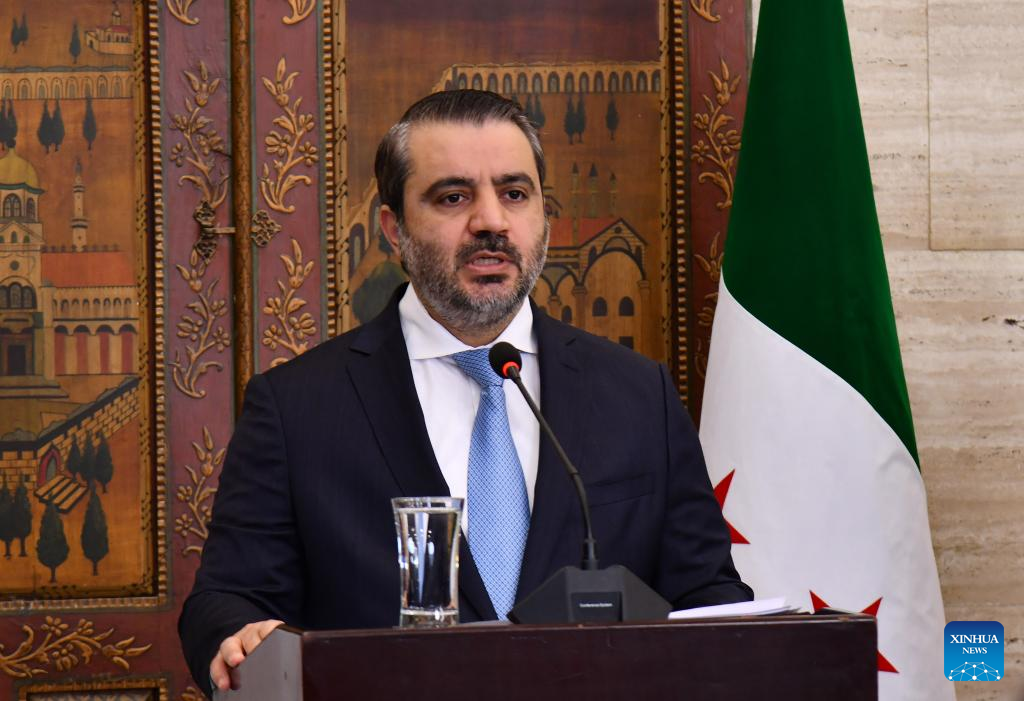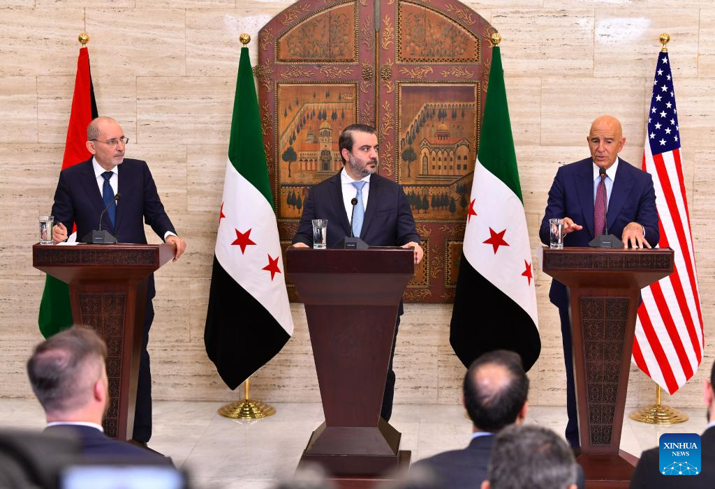 Foreign affairs chief of Syrian authorities Assad Hassan al-Shibani address a joint press conference held with Jordanian Foreign Minister Ayman Safadi and U.S. special envoy to Syria Thomas Barrack after their meeting in Damascus, Syria, on Sept. 16, 2025. Syrian authorities on Tuesday unveiled a seven-point roadmap to address the months-long crisis in the southern province of Sweida. (Photo by Ammar Safarjalani/Xinhua)