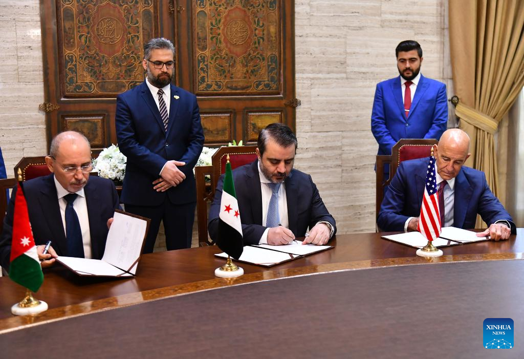 Foreign affairs chief of Syrian authorities Assad Hassan al-Shibani (C), Jordanian Foreign Minister Ayman Safadi (L) and U.S. special envoy to Syria Thomas Barrack (R) sign a document in Damascus, Syria, Sept. 16, 2025. Syrian authorities on Tuesday unveiled a seven-point roadmap to address the months-long crisis in the southern province of Sweida. (Photo by Ammar Safarjalani/Xinhua)