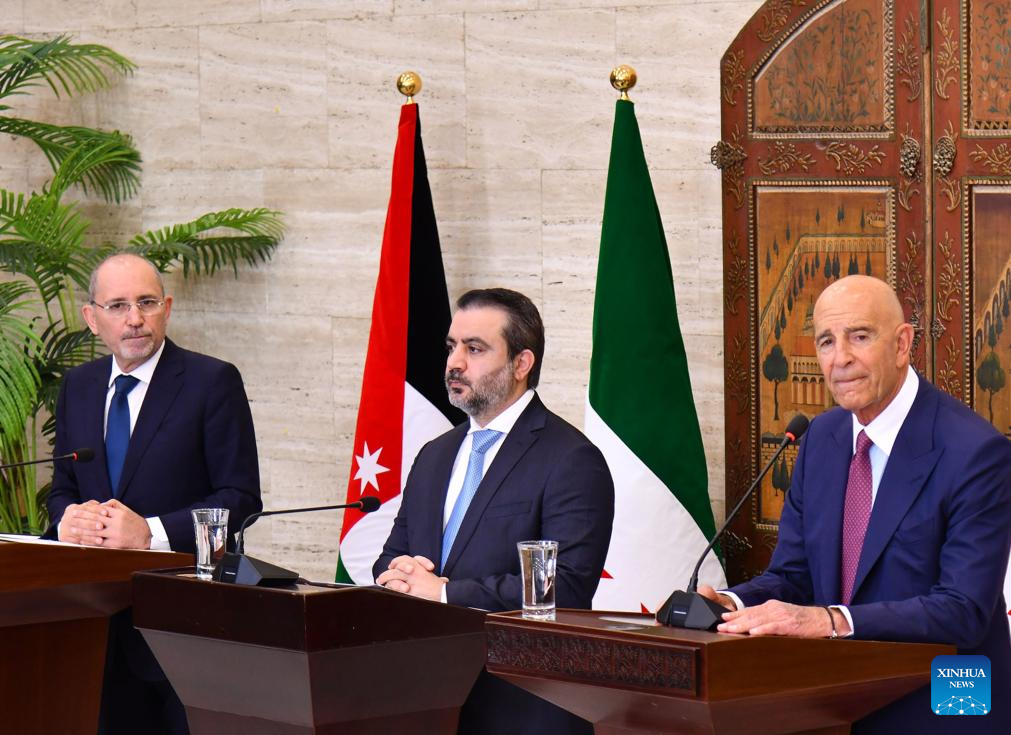Foreign affairs chief of Syrian authorities Assad Hassan al-Shibani (C), Jordanian Foreign Minister Ayman Safadi (L) and U.S. special envoy to Syria Thomas Barrack (R) attend a joint press conference in Damascus, Syria, Sept. 16, 2025. Syrian authorities on Tuesday unveiled a seven-point roadmap to address the months-long crisis in the southern province of Sweida. (Photo by Ammar Safarjalani/Xinhua)