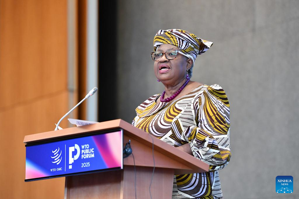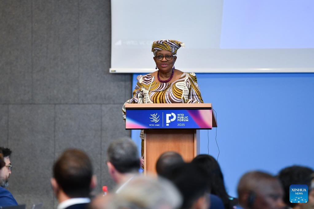 The World Trade Organization (WTO) Director-General Ngozi Okonjo-Iweala speaks during the launch of the 2025 edition of the World Trade Report, the WTO's flagship publication, at the WTO headquarters in Geneva, Switzerland, Sept. 17, 2025. The WTO said Wednesday that the use of artificial intelligence (AI) could boost global trade by nearly 40 percent by 2040, while emphasizing the need to bridge digital divides. (Xinhua/Lian Yi)
