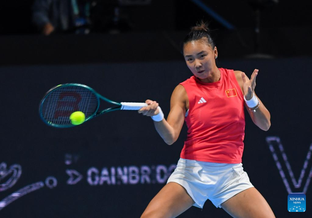 Yuan Yue of China hits a return during the women's singles match against Elisabetta Cocciaretto of Italy in the quarterfinal between China and Italy at the 2025 Billie Jean King Cup Finals in Shenzhen, south China's Guangdong Province, Sept. 16, 2025. (Xinhua/Mao Siqian)