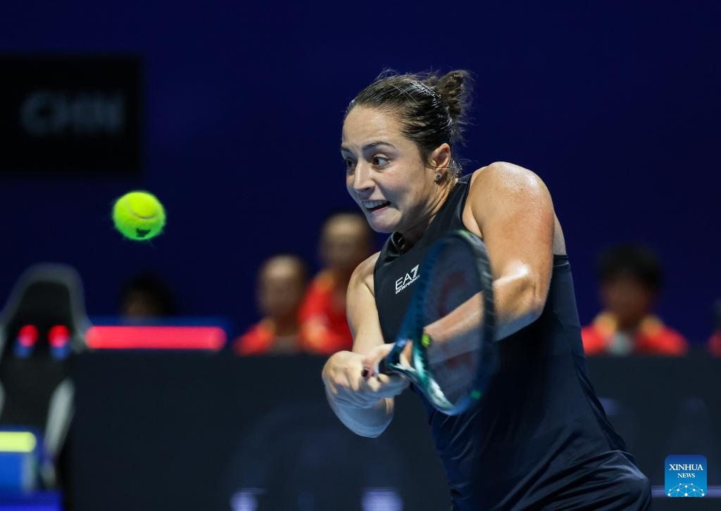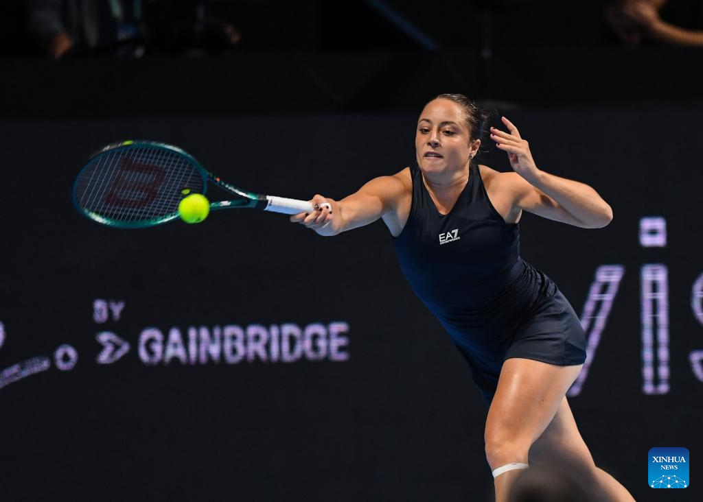 Elisabetta Cocciaretto of Italy hits a return during the women's singles match against Yuan Yue of China in the quarterfinal between China and Italy at the 2025 Billie Jean King Cup Finals in Shenzhen, south China's Guangdong Province, Sept. 16, 2025. (Xinhua/Mao Siqian)