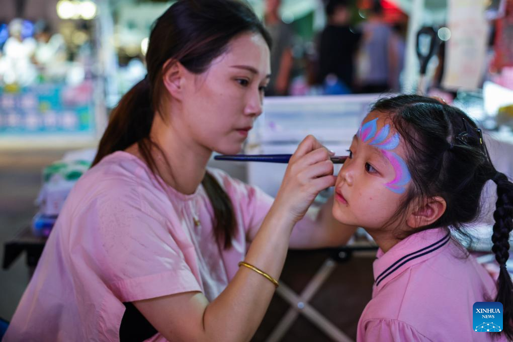 A woman works on a face painting for a girl at a market set up next to the Zhuji city basketball center in Taozhu Street of Zhuji, east China's Zhejiang Province, on Sept. 16, 2025. A market has recently been set up next to the Zhuji city basketball center, a venue for ZheBA, Zhejiang's province-wide community basketball league. The market serves as a multi-business platform which combines sports, shopping and catering. (Xinhua/Xu Yu)