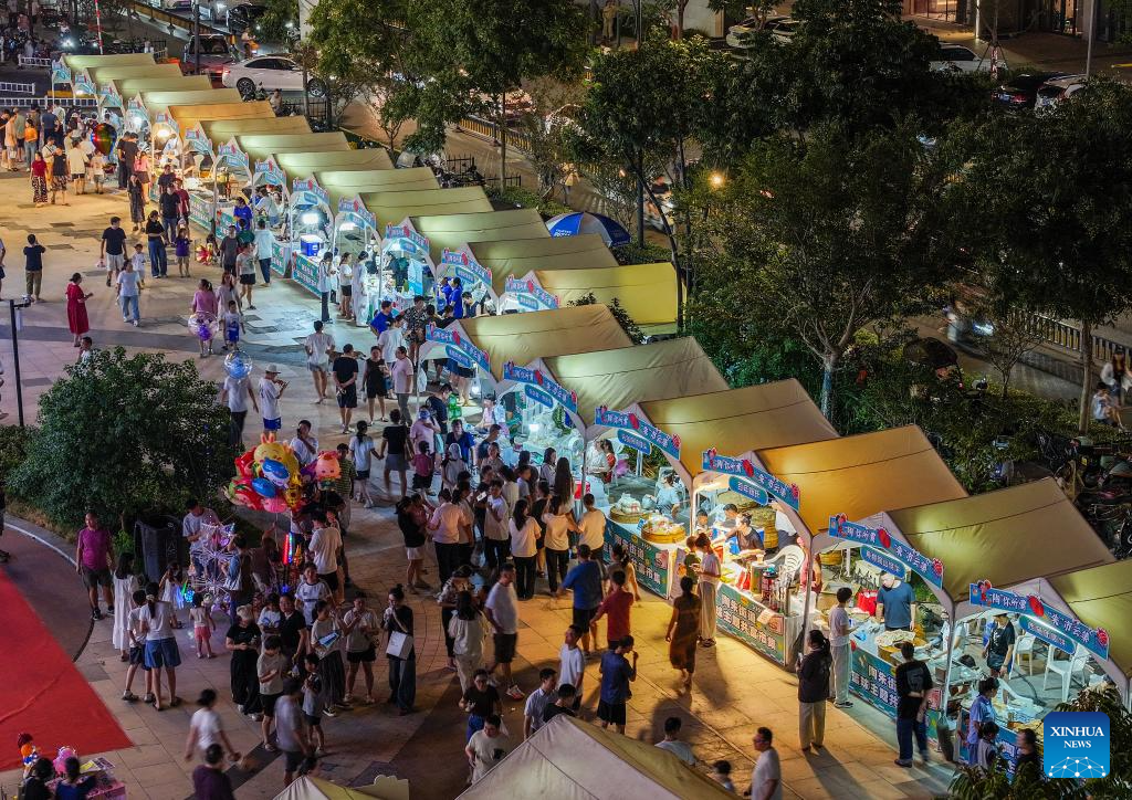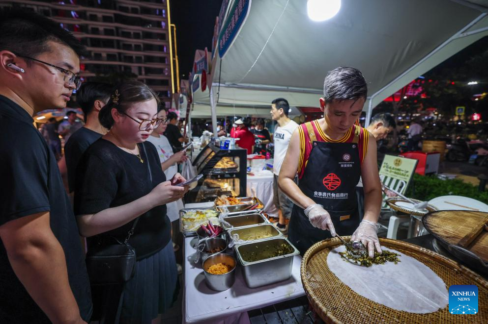 Citizens buy local specialty foods at a market set up next to the Zhuji city basketball center in Taozhu Street of Zhuji, east China's Zhejiang Province, on Sept. 16, 2025. A market has recently been set up next to the Zhuji city basketball center, a venue for ZheBA, Zhejiang's province-wide community basketball league. The market serves as a multi-business platform which combines sports, shopping and catering. (Xinhua/Xu Yu)