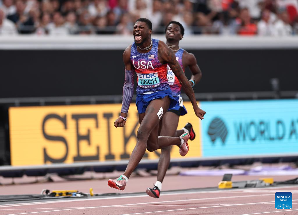 Cordell Tinch of The United States celebrates after the men's 110m hurdles final at the 2025 World Athletics Championships in Tokyo, Japan, Sept. 16, 2025. (Xinhua/Jia Haocheng)