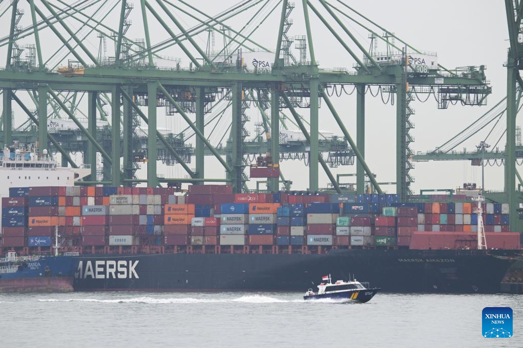 A ship loads and unloads containers at Singapore's Pasir Panjang terminal on Sept. 17, 2025. Singapore's non-oil domestic exports (NODX) contracted by 11.3 percent in August from a year earlier, following the 4.7 percent decline recorded in July, according to data released Wednesday by Enterprise Singapore. (Photo by Then Chih Wey/Xinhua)