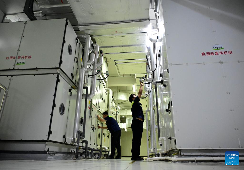 Staff members maintain a fresh air heat recovery system in the Passive House Technology Center of Qingdao Sino-German Ecopark in Qingdao, east China's Shandong Province, July 29, 2025. (Xinhua/Li Ziheng)