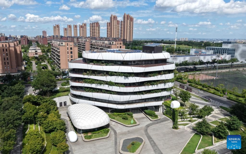 This aerial drone photo taken on July 29, 2025 shows the Passive House Technology Center at Qingdao Sino-German Ecopark in Qingdao, east China's Shandong Province. (Xinhua/Li Ziheng)
