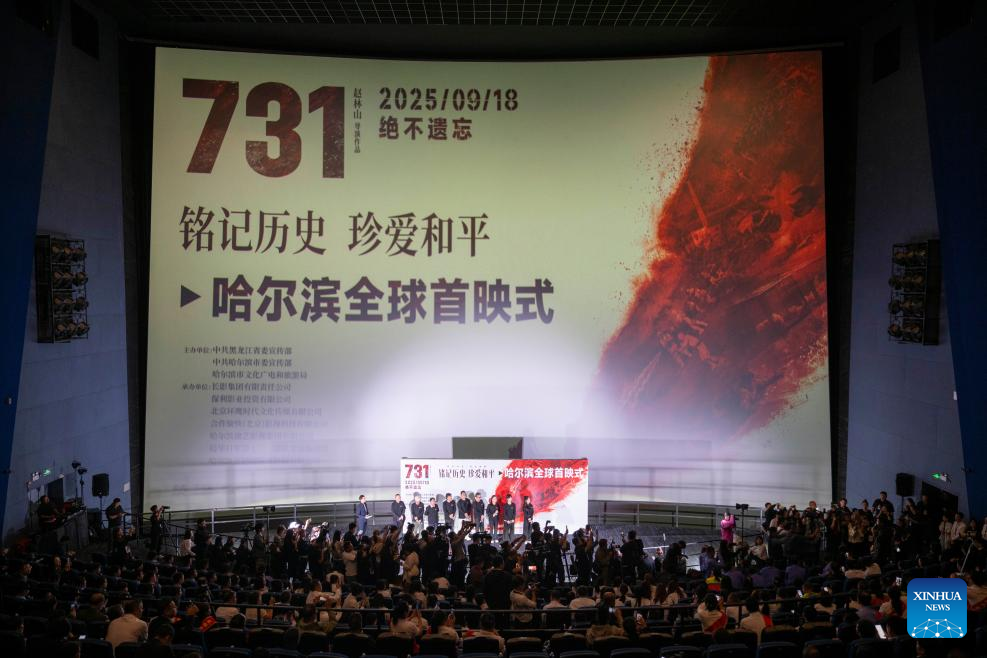 This photo taken on Sept. 17, 2025 shows the world premiere of the film "Evil Unbound" in Harbin, northeast China's Heilongjiang Province. "Evil Unbound," a film about Unit 731, held its world premiere on Wednesday in Harbin, where this notorious Japanese germ warfare unit was once based, highlighting the atrocities committed by Japanese invading forces in China in World War II. The movie tells the story of Wang Yongzhang, a local vendor, and others imprisoned in the "special prison" of Unit 731, where they were lured by false promises of freedom in return for cooperating with supposed health checks and disease prevention research, only to become victims of horrific medical experiments, including frostbite tests, gas exposure and vivisection. (Xinhua/Zhang Tao)