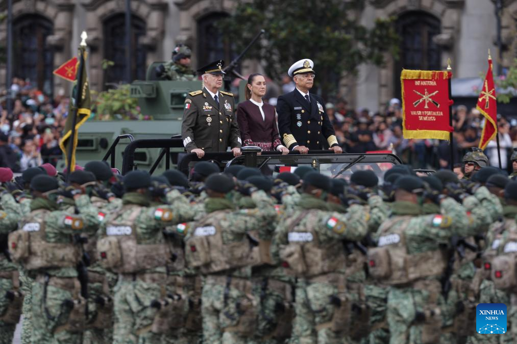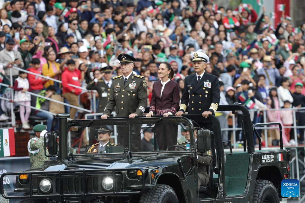 Mexican president Claudia Sheinbaum (C) attends an Independence Day military parade at the Zocalo Square in Mexico City, Mexico, on Sept. 16, 2025. (Photo by Francisco Canedo/Xinhua)
