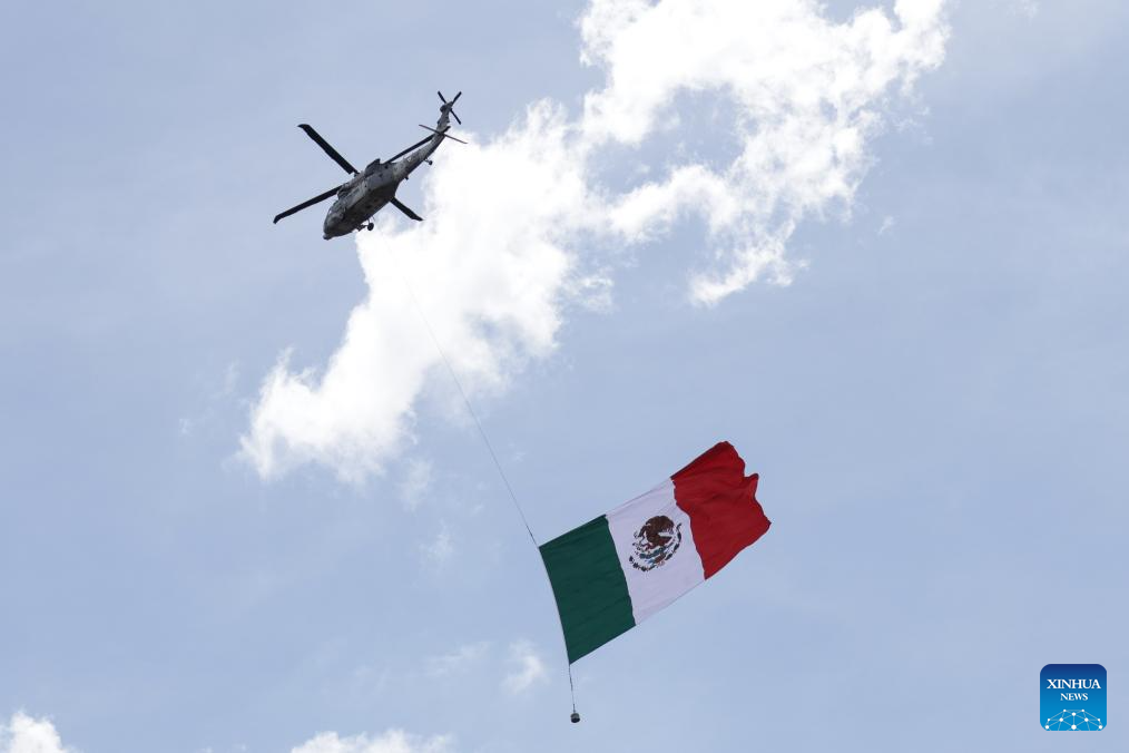 A military helicopter carrying the Mexican flag flies over the Zocalo Square during an Independence Day military parade in Mexico City, Mexico, Sept. 16, 2025. (Photo by Francisco Canedo/Xinhua)