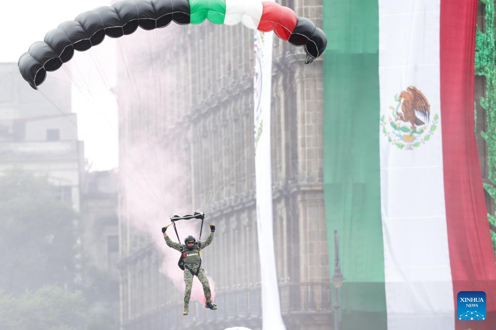 A paratrooper lands at the Zocalo Square during an Independence Day military parade in Mexico City, Mexico, Sept. 16, 2025. (Photo by Francisco Canedo/Xinhua)