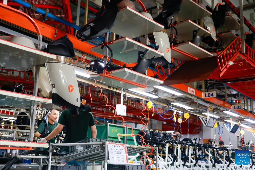 This photo shows the production line of YADEA at the electric scooter industrial park in Xishan District, Wuxi, east China's Jiangsu Province, Sept. 16, 2025. Wuxi City has been actively building an open economy in recent years. The number of enterprises with actual foreign trade transactions in the city has exceeded 13,000, and their annual foreign trade value stood at more than 100 billion US dollars over the past four years.