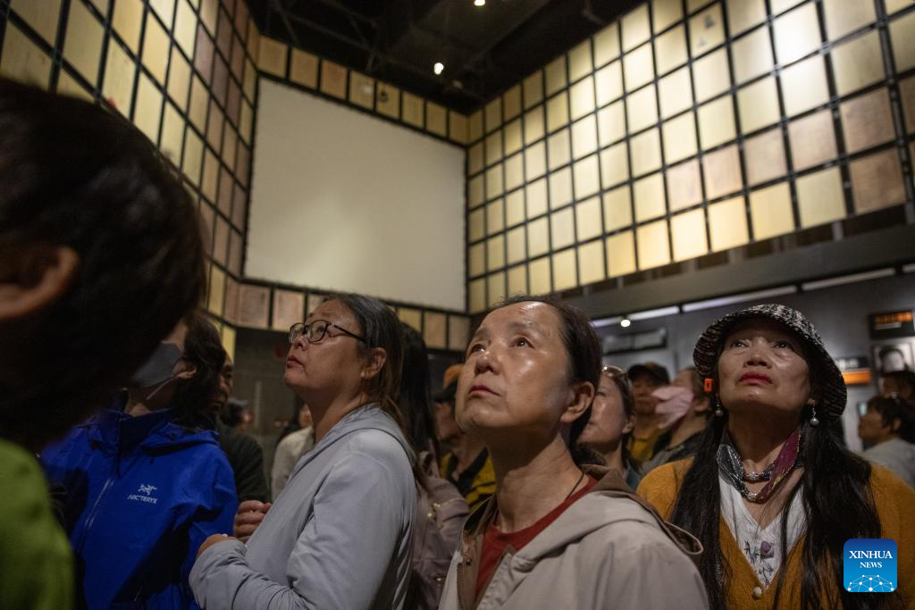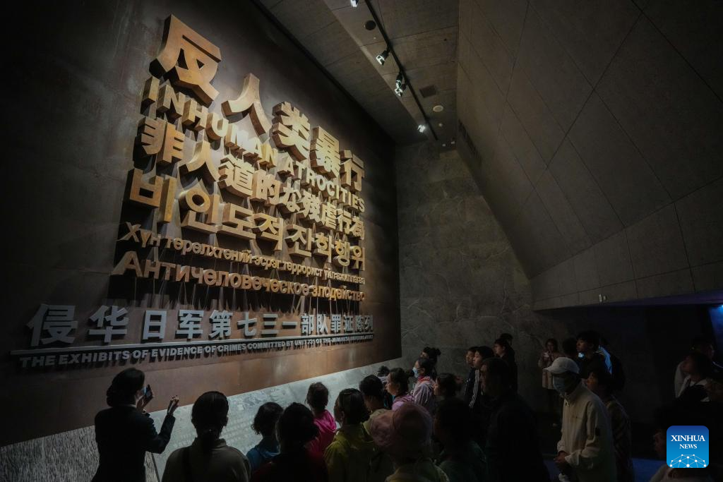 People visit the Exhibition Hall of Evidence of Crimes Committed by Unit 731 of the Japanese Imperial Army in Harbin, capital of northeast China's Heilongjiang Province, Sept. 18, 2025. "The real history is far more brutal than what the film can depict," said Jin Chengmin, curator of the Exhibition Hall of Evidence of Crime Committed by Unit 731 of the Japanese Imperial Army.