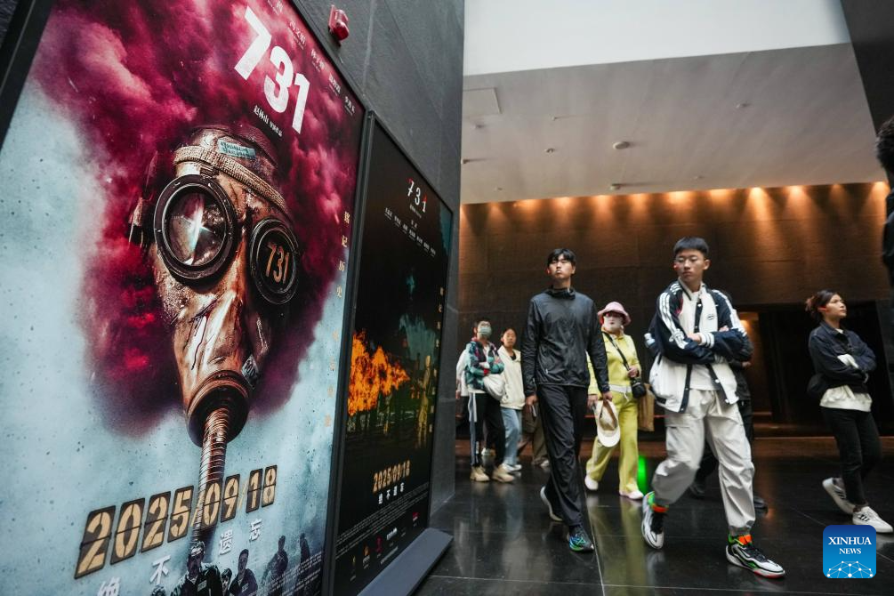 People walk past a poster of the film "Evil Unbound" at the Exhibition Hall of Evidence of Crimes Committed by Unit 731 of the Japanese Imperial Army in Harbin, capital of northeast China's Heilongjiang Province, Sept. 18, 2025. "The real history is far more brutal than what the film can depict," said Jin Chengmin, curator of the Exhibition Hall of Evidence of Crime Committed by Unit 731 of the Japanese Imperial Army.