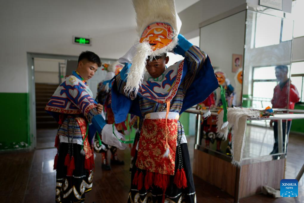 Students put on Tibetan opera costumes at Lhasa No. 2 secondary vocational and technical school in Lhasa, southwest China's Xizang Autonomous Region, Sept. 9, 2025.