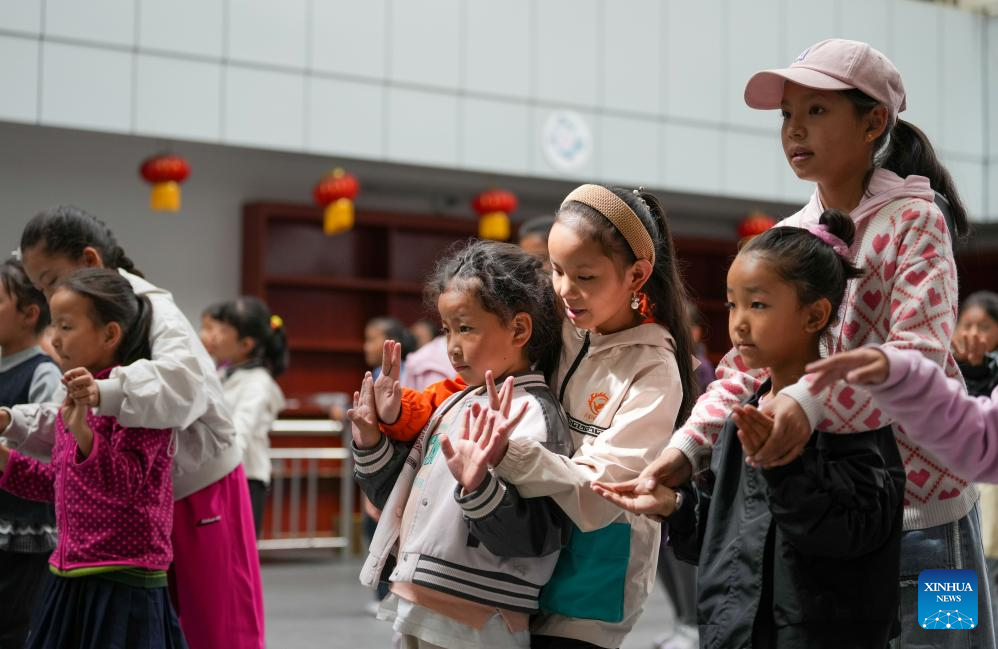 Children learn Tibetan opera at a public art center in Lhasa, southwest China's Xizang Autonomous Region, Sept. 14, 2025.