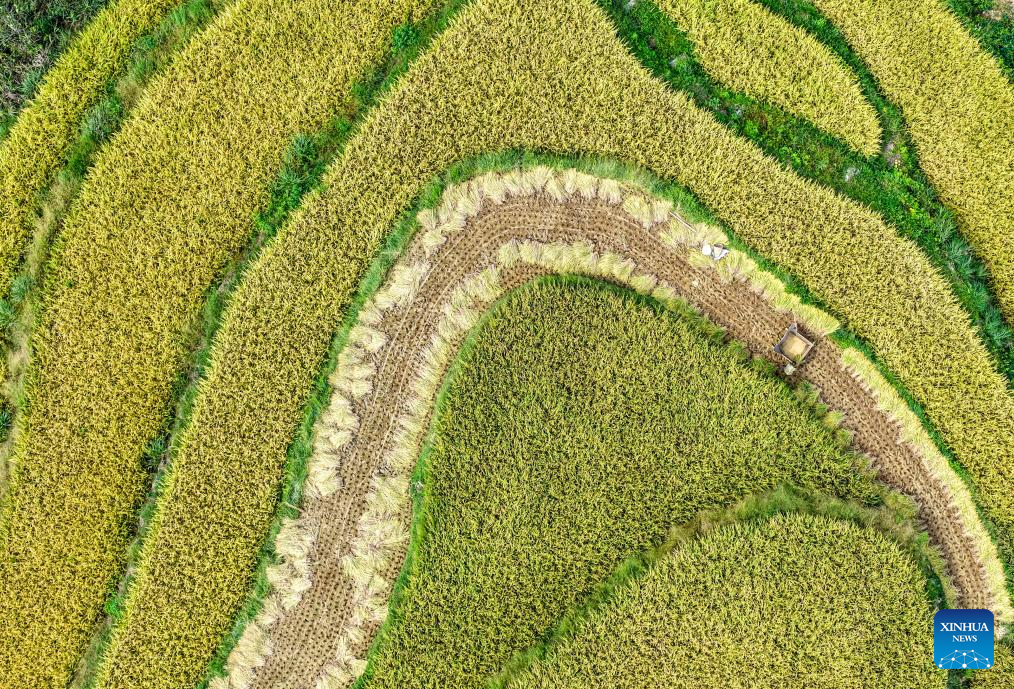An aerial drone photo taken on Sept. 18, 2025 shows terraced fields in Wuli Town, Qianjiang District, southwest China's Chongqing Municipality. Chongqing's Wuli Town, which is home to about 5,300 mu (about 353.33 hectares) of paddy fields, has recently entered the rice harvest season. (Xinhua/Tang Yi)