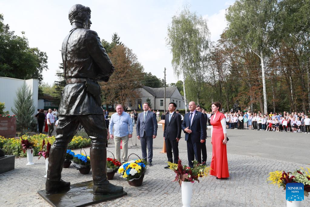 Chinese Ambassador to Ukraine Ma Shengkun (C, front), Deputy Governor of Cherkasy region Oleksandr Turcheniak (2nd L, front) and sculptor Veronika Dirova (1st R, front) lay flowers at the bronze statue of pilot Grigori Kulishenko in Cherepyn, Ukraine, Sept. 1, 2025. (Xinhua/Li Dongxu)