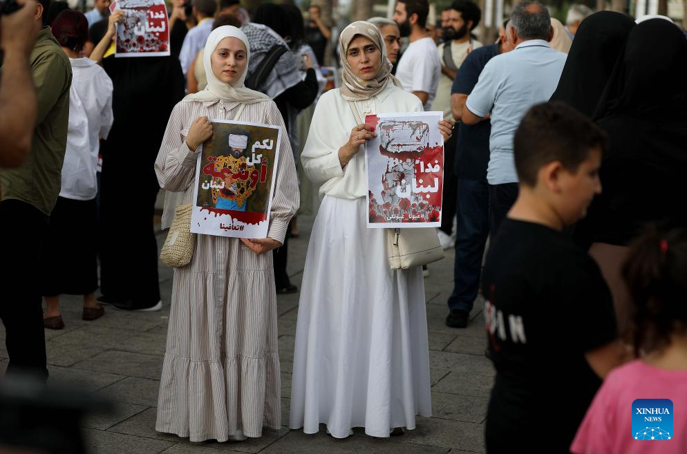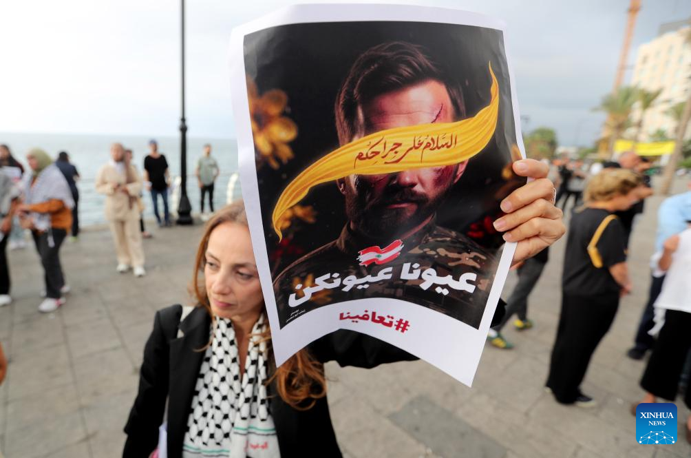A woman holds a sign showing support for the victims of the pager explosion on the first anniversary of the attack in Beirut, Lebanon, on Sept. 17, 2025. (Xinhua/Bilal Jawich)