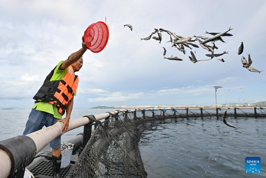 A staff member feeds tunas at an offshore yellowfin tuna breeding base in Lingshui Li Autonomous County, south China's Hainan Province, on Sept. 17, 2025. In recent years, Hainan Province has accelerated the development of its fishery industry by giving full play to its advantages in marine fisheries.
