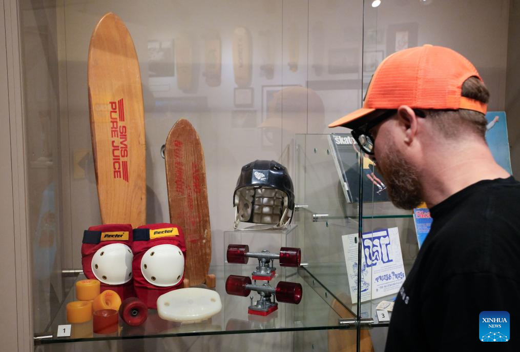 The exhibition, which will be opened on Saturday, features interactive displays, vintage boards, photos and video footage showcasing skateboarding culture in the 1970s and 1980s. (Photo by Liang Sen/Xinhua)