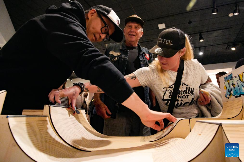 People play finger skateboards during the preview event of "The Maple Road Experience," a skateboarding culture exhibition, at the Richmond Museum in Richmond, British Columbia, Canada, Sept. 18, 2025.