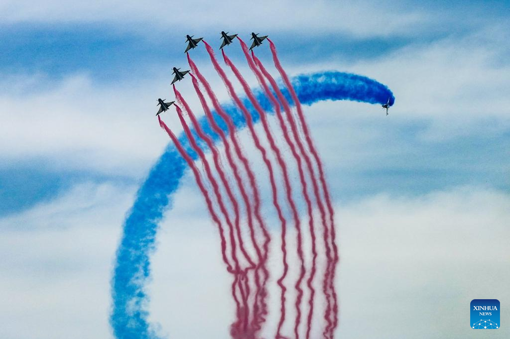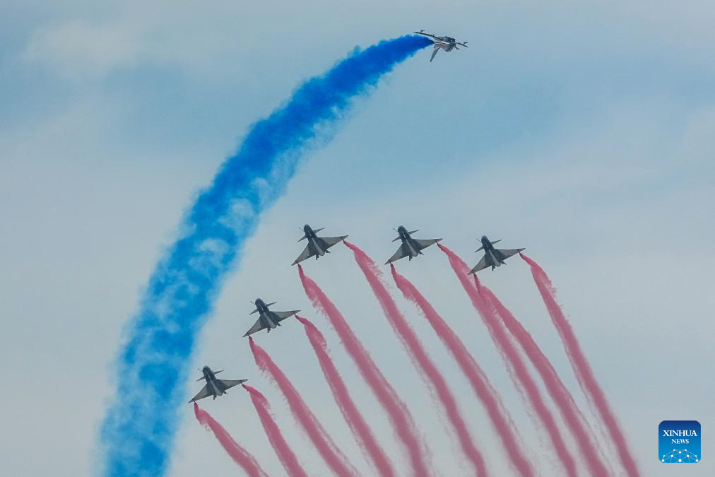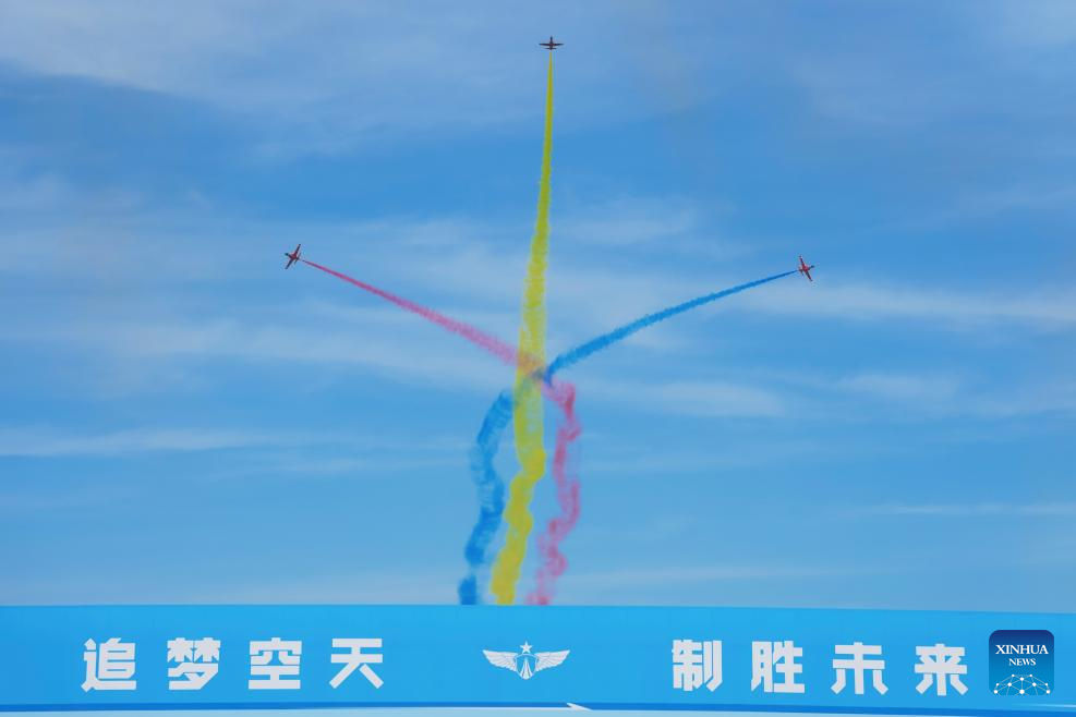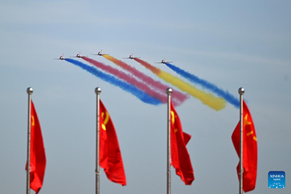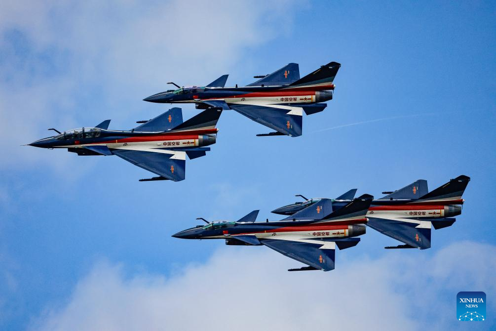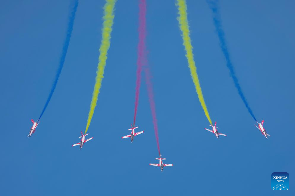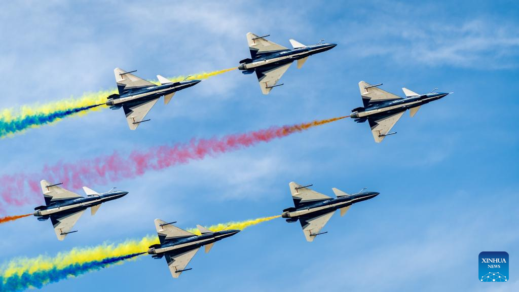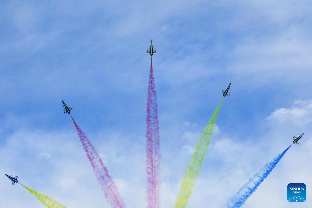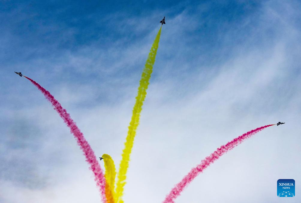 Aircraft of the Bayi Aerobatic Team of the Chinese People's Liberation Army Air Force perform during the 2025 aviation open-day activities of the Chinese People's Liberation Army Air Force and Changchun Air Show in Changchun, northeast China's Jilin Province, Sept. 19, 2025. The events kicked off here on Friday. (Xinhua/Tang Chengzhuo)