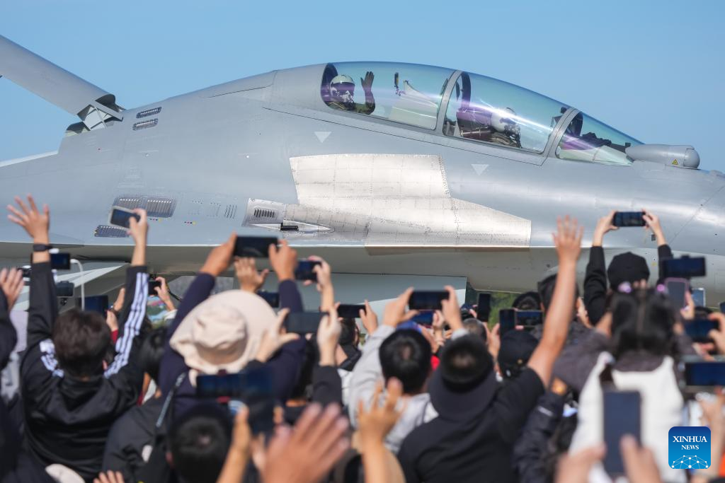 Pilots of a J-16 fighter jet greet the audience during the 2025 aviation open-day activities of the Chinese People's Liberation Army Air Force and Changchun Air Show in Changchun, northeast China's Jilin Province, Sept. 19, 2025. The events kicked off here on Friday. (Xinhua/Xu Chang)