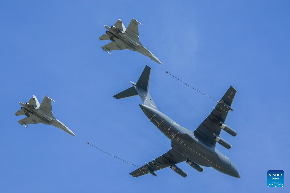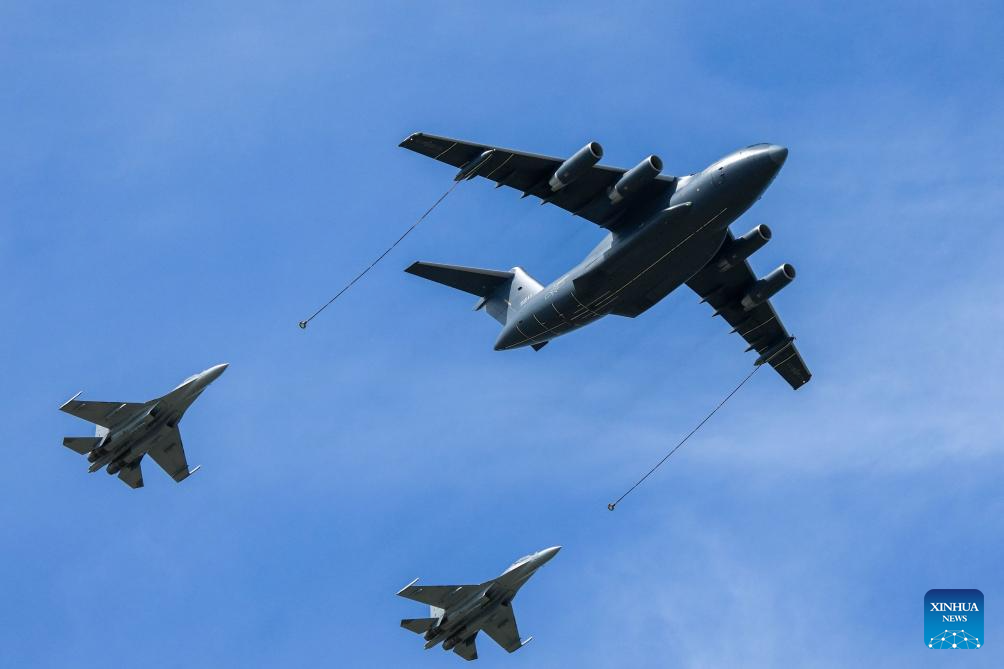 A YY-20A tanker aircraft and two J-16 fighter jets are pictured during the 2025 aviation open-day activities of the Chinese People's Liberation Army Air Force and Changchun Air Show in Changchun, northeast China's Jilin Province, Sept. 19, 2025. The events kicked off here on Friday. (Xinhua/Yan Linyun)