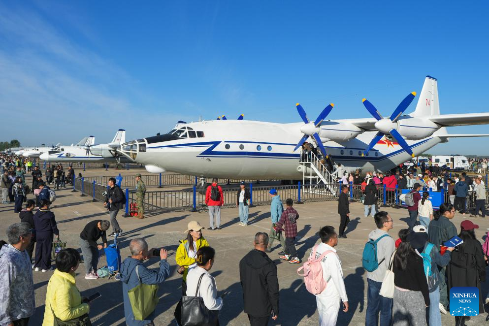 People view a Y-8 cargo plane during the 2025 aviation open-day activities of the Chinese People's Liberation Army Air Force and Changchun Air Show in Changchun, northeast China's Jilin Province, Sept. 19, 2025. The events kicked off here on Friday. (Xinhua/Xu Chang)