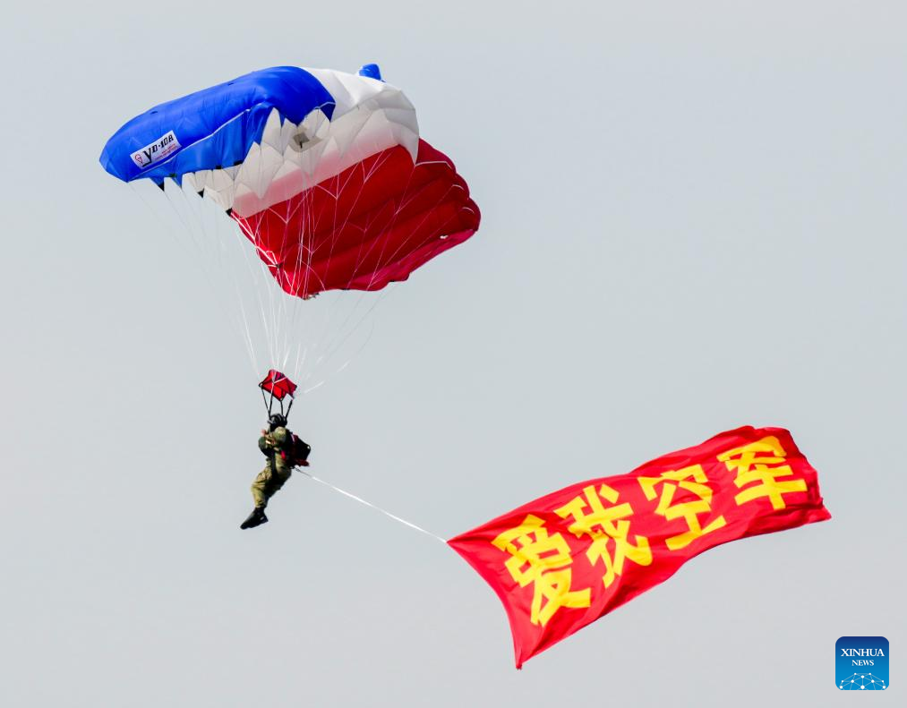 Members of the Bayi Parachute Team of the Chinese People's Liberation Army Air Force perform during the 2025 aviation open-day activities of the Chinese People's Liberation Army Air Force and Changchun Air Show in Changchun, northeast China's Jilin Province, Sept. 19, 2025. The events kicked off here on Friday. (Xinhua/Yan Linyun)
